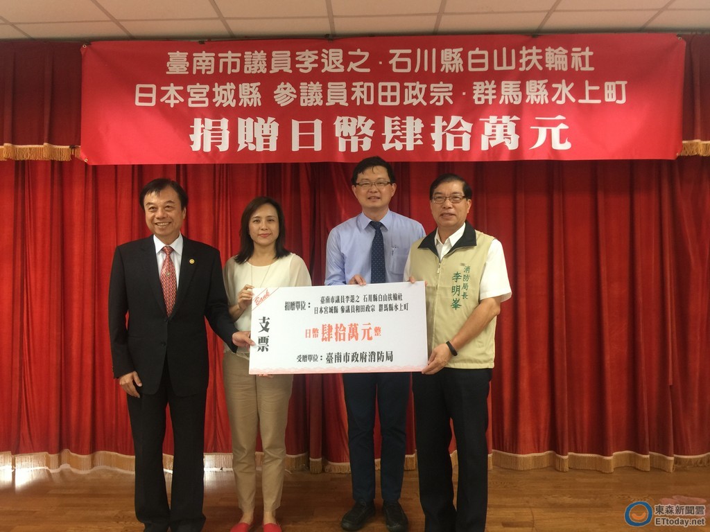▲台南市議員李退之、日本參議員和田政宗及民間社團,集資捐贈台南市消防局日幣40萬元。(圖/消防局提供)