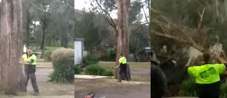 一對澳洲夫妻日前度假時發現,一旁的公園裡有一棵樹因為先前的狂風暴雨而產生裂痕,於是告知公園的主人這個消息。隨後公園主人請來工人,將這棵大樹給鋸掉,不過卻因為方向沒有對準,以至於樹倒下之後將一旁的小木屋也給壓毀了!