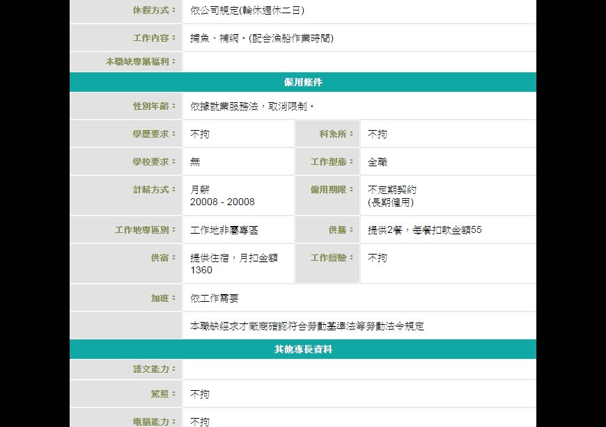 實際看看徵才頁面,工作內容為捕魚、補網,且要配合漁船作業時間,依公司規定休假,還得視需要加班;雇用條件上,雖不要求學校科系和學歷,但薪水每個月僅20,008元,還要扣掉住宿費1360元,以及上班日所提供的2餐,每餐扣款55元,實際月薪根本不到最低薪資。