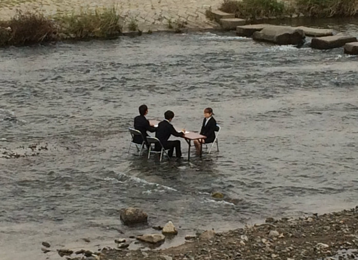 日本人94狂!一位日本網友12日在推特上傳2張照片,2男1女早晨7時在鴨川河面上面試。網友都驚呆了,截至目前為止,已獲得2.9萬個讚與2.8萬次分享。