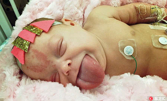 佩斯利的例子就是舌頭過度生長,和成人的舌頭一樣大、是小小嘴的2倍,醫生更說,她的舌頭是他們見過病童中最大的。「她的舌頭不斷長出嘴巴,害她總是咬到舌頭,而且嘴巴空間不夠放,只能伸出來,讓她的臉看起來笨笨的。」佩斯利21歲的母親麥迪森(Madison)告訴Caters通訊社。