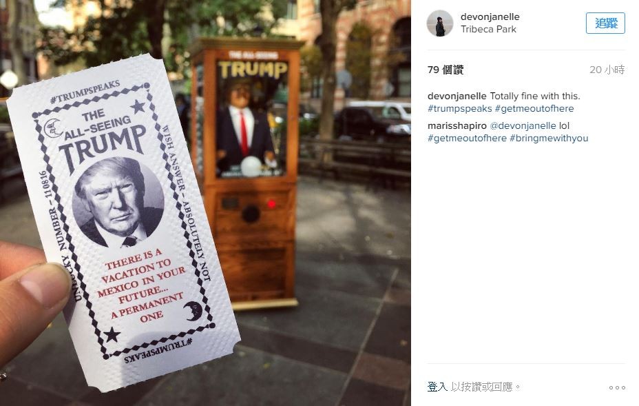 美國紐約知名地標哥倫布圓環出現「川普占卜機器人」,點下開關就會吐出印有川普肖像的卡紙,上面多寫道關於興建高速鐵路、驅逐1千萬墨西哥非法移民等政策;據了解這是由一群匿名的藝術家所創作,引起許多民眾上前圍觀拍照。但也有不少網友認為,美國總統選舉「已經成為全球的笑柄」。