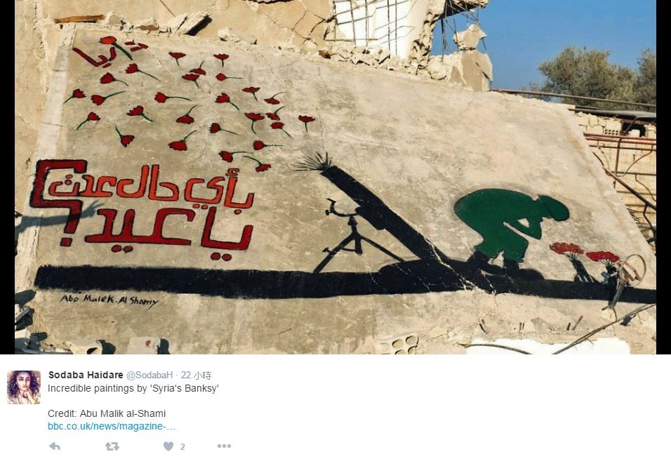 敘利亞內戰已長達5年之久,首都大馬士革許多房屋遭攻擊只剩斷垣殘壁,但有位22歲效力於反抗軍的男子在牆上作畫,藉此反映百姓心中渴望的和平反戰;他表示,早上需要到前線作戰,只能利用空餘的時間繪畫。這些藝術作品也讓他獲得「敘利亞班克斯」稱號。
