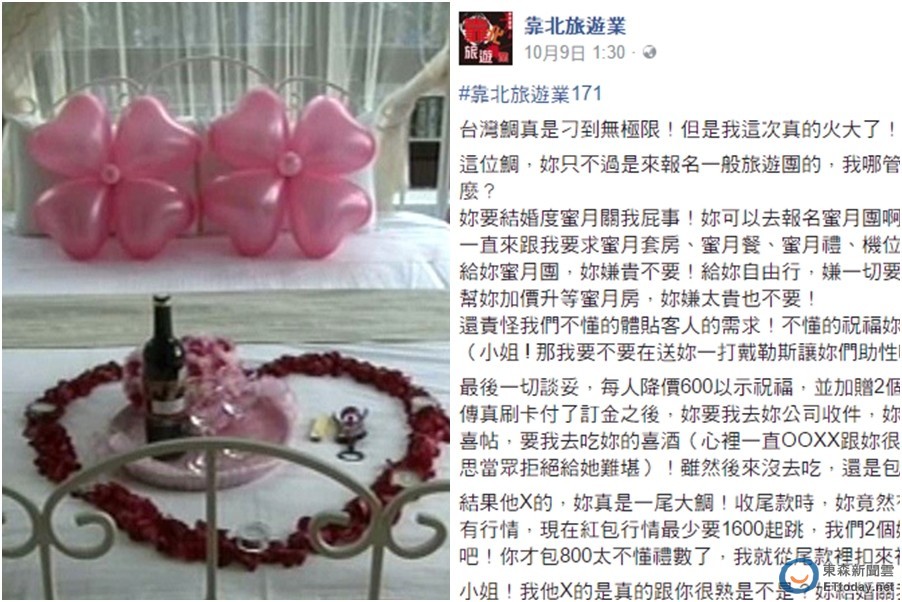 「台灣鯛真是刁到無極限!」有旅遊從業人員PO文抱怨,遇到一對新婚夫妻奧客來報名跟團,卻不斷要求蜜月升等,最後降價600元以示祝福、加贈禮物成交,沒想到竟收到一張喜帖,包了800元紅包送去被嫌少,還硬拗從旅費尾款扣來補;女客人事後客訴他,老闆接到電話一句話霸氣回應,被網友讚爆!