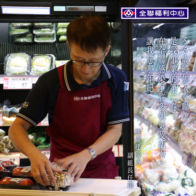 在全聯桃園建國門市服務的任鎔,退休前曾在各大超市工作,對生鮮蔬果很有研究,將實務經驗能分享顧客,像是美生菜的特色是甘脆微苦,是大人愛吃的口感;小朋友較愛葉薄、質地細的結球萵苣,提供不少主婦買菜的建議,他表示:「二度就業夥伴都很珍惜這份工作,幾乎都期待能好好做到退休65歲。」