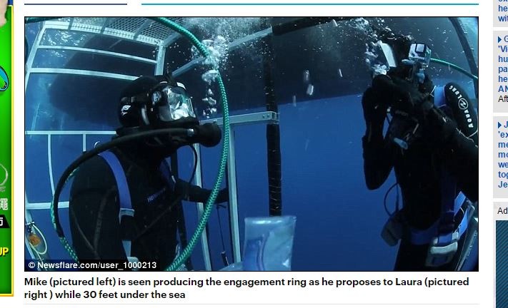 麥克說,「我覺得是時候換我『主動出擊』了,於是我決定要嘗試這樣做--淹沒在鯊魚籠中時求婚。」「還有什麼地方更適合兩位鯊魚迷的?」他將求婚戒指裝在小塑膠袋中,並在下水後秀出;而對方一看到戒指,便難掩興奮,立刻就答應了。他說,因為天氣比他所預想的還要糟,他原本還很擔心能否在鯊籠中求婚。