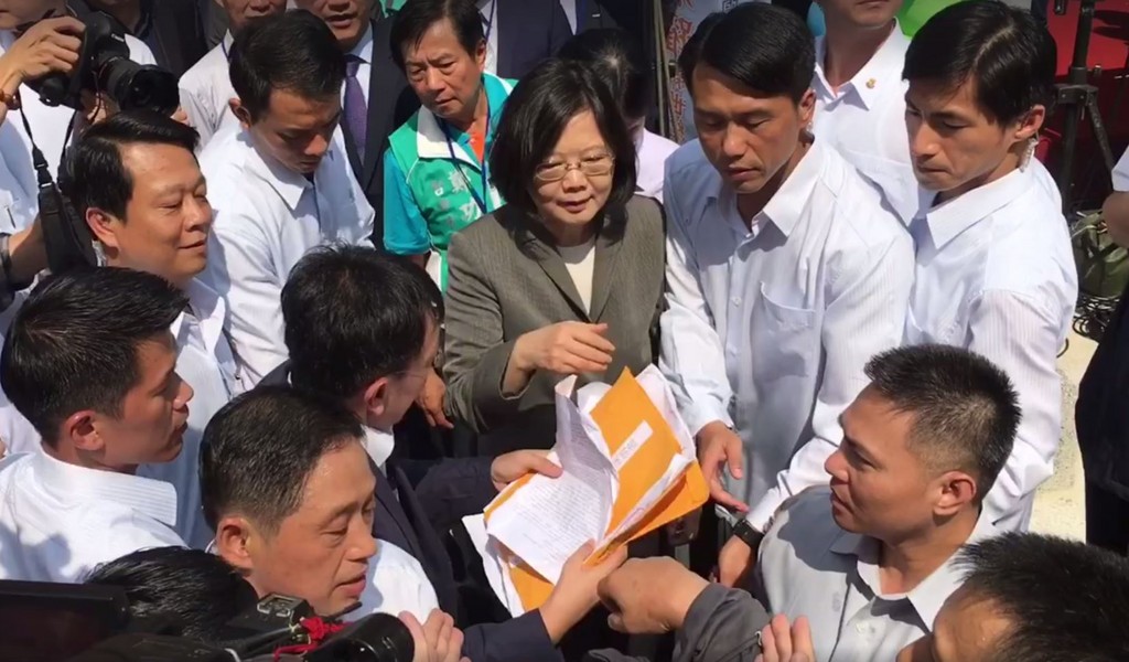 為此,總統府派副祕書長姚人多去接見抗議人士,並引領前來接見蔡英文;而就在見到蔡英文時,自救會成員卻突然激動下跪,高喊「請總統救救我們」,場面頓時一片混亂。蔡英文只好不斷說「好好好」相勸,並在與自救會成員握手,接下陳情書後,即轉身離開。