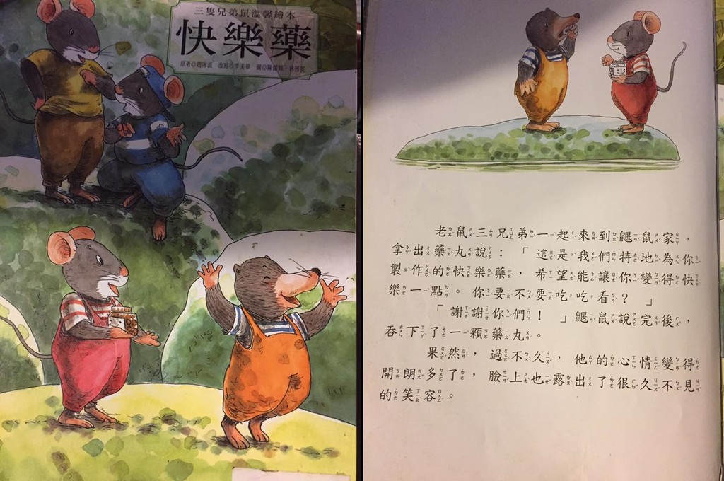 有的繪本在純真的孩子眼裡十分溫馨,但對早已「回不去」的大人來說,可能會有「歪掉」的解讀。歌手閻韋伶在臉書PO出童書《快樂藥》的部分內容,描述老鼠三兄弟特製了「快樂藥」,讓原本心情不好的鼴鼠吃了以後開朗許多,感人故事卻讓許多網友笑說「這樣合法嗎?」