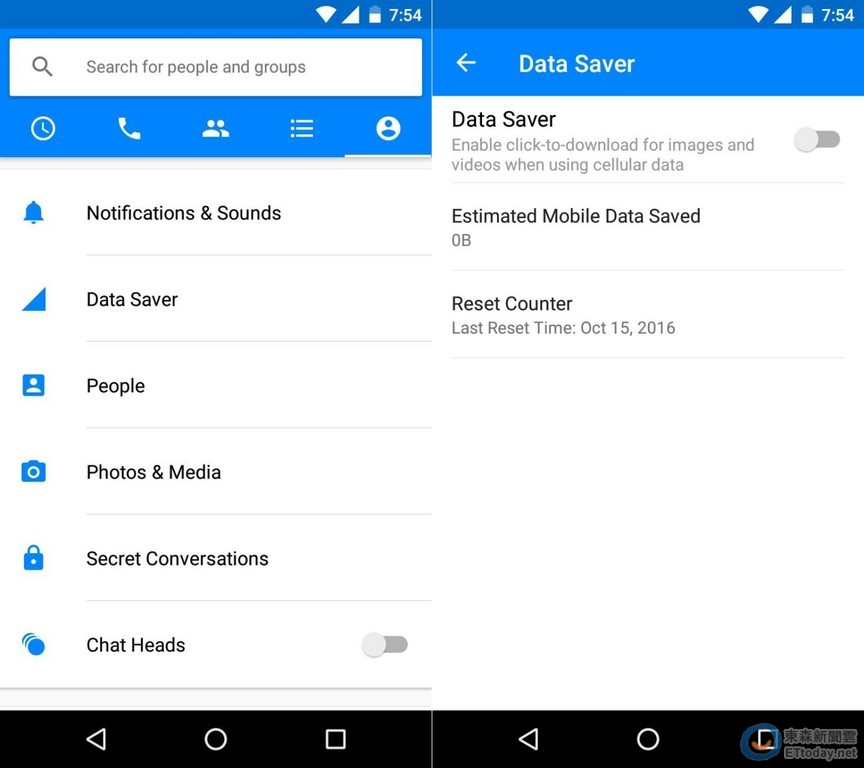 從測試版本中可發現,在個人選項中多了一個 Data Saver 的功能,點擊進入後即可選擇開啟 / 關閉,開啟後只要收到圖片或影片,即會自動顯示下載視窗,讓使用者自行選擇下載與否並節省流量,而當連接到 Wi-Fi 時,此功能即會自動關閉,可直接顯示下載的照片或影片外,也能看目前節省的流量大小,但記者實際下載 Beta 版本後,尚無 Data Saver 功能顯示。