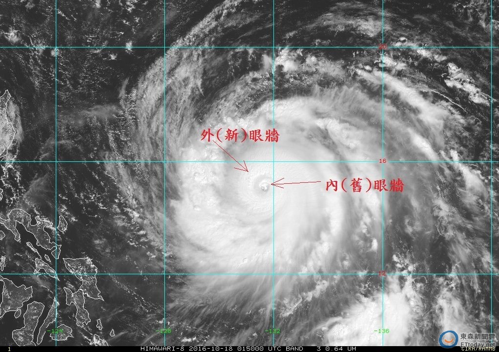 海馬颱風增強為強烈颱風後,目前位在台灣東南東方約1500公里處,持續朝西北西方向前進,中央氣象局預報中心主任鄭明典原先提到,預估「可能繞著台灣轉入西風帶。」現又觀察到它出現一道完整新眼牆,「比原先的還厚實,還有機會再增強!」 預計周四周五最接近台灣。
