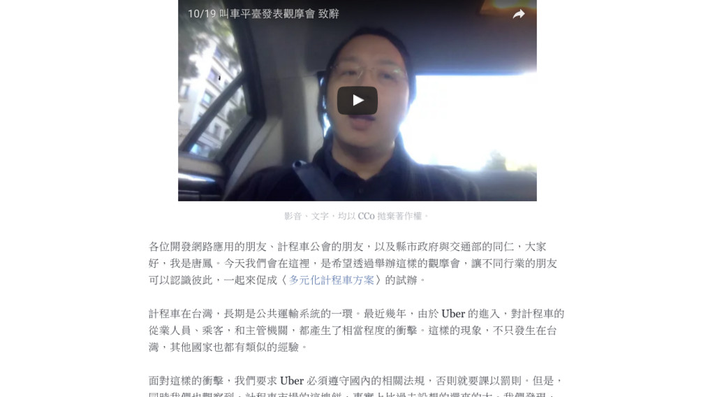 ▲唐鳳用網誌+錄製影片方式替叫車平臺發表觀摩會致辭。(圖/取自唐鳳網誌)