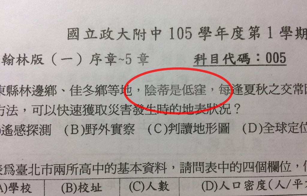 臉書粉絲專頁「黑特八校」16日貼出一份讓人傻眼的段考考卷,上方載明是政大附中105學年度第1學期高一的地理科試題。題目寫道,「屏東縣林邊鄉、佳冬鄉等地,陰蒂是低窪,每逢夏秋之交常......。」其中,「陰蒂是低漥」應為「因地勢低窪」。