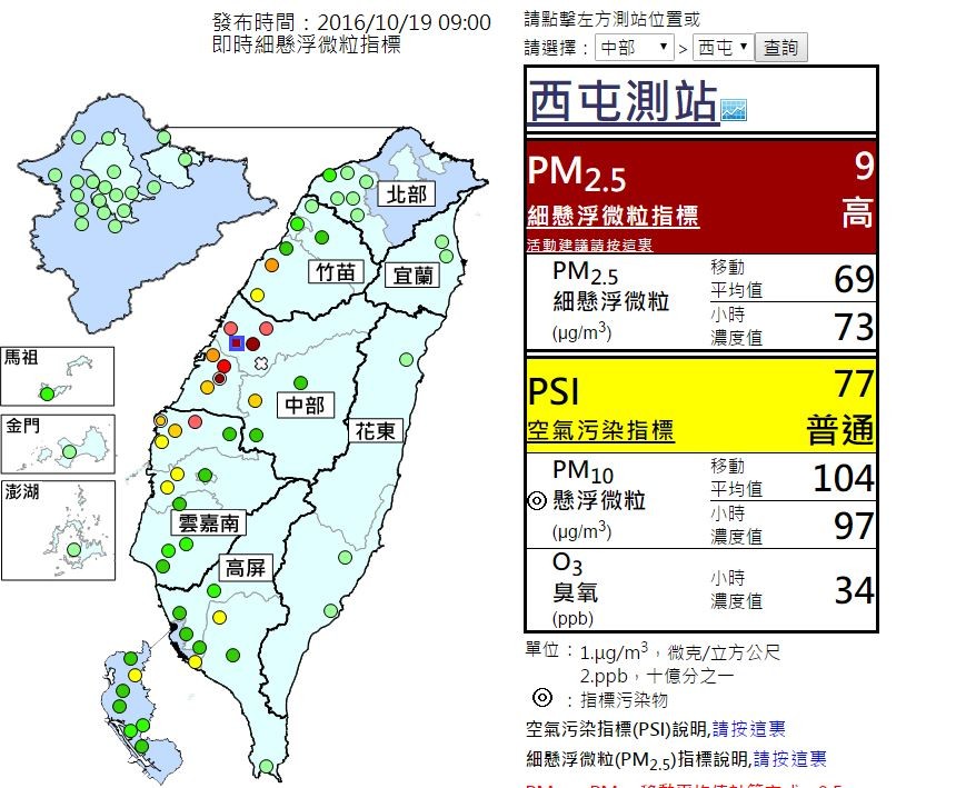 空氣品質監測網指出,中部地區受擴散條件不良影響,細懸浮微粒濃度偏高,局部地區達非常高等級,提醒敏感族群避免在戶外劇烈活動。中南部空氣品質連續幾天都是不佳狀態,環保署18日也發布新聞稿說明,接連受到莎莉佳、海馬颱風外圍環流所造成的背風面弱風區,以及下沉氣流影響,竹苗至高屏一帶空氣擴散能力不佳,使得污染物容易累積,導致空氣品質出現不良甚至非常不良的情況。