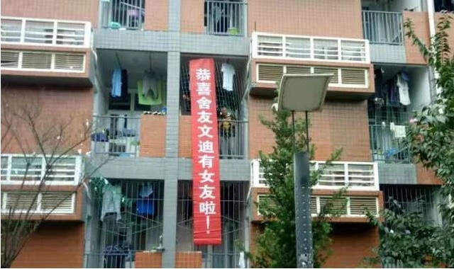 《重慶晨報》報導,重慶郵電大學移通學院的宿舍外近日被人發現掛出一張紅布條,上頭寫著「恭喜舍友文迪有女友啦!」經過瞭解,文中寫的文迪是該宿舍的舍長,目前就讀大二,最近終於找到了女朋友,成為宿舍中最後一個「脫單」的,因此室友、同學們就想到掛布條為他慶祝。