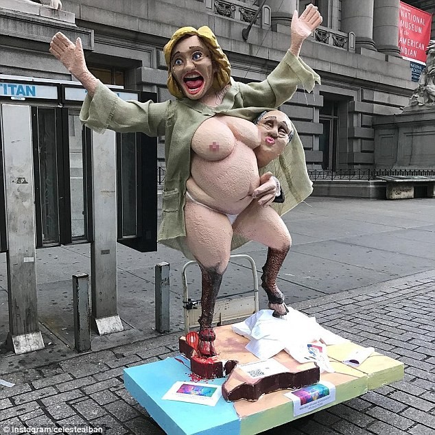 ▲希拉蕊塑像腳下有蹄,腳踩一堆遭刪除的電子郵件。旁邊還有一名華爾街銀行家十分猥褻的抱著她。(圖/翻攝自Instagram)