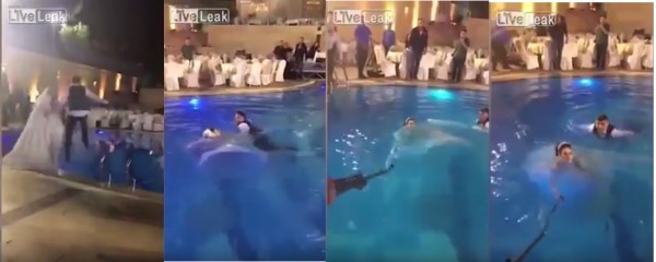 隨著時代的進步與開放,現代人的婚禮安排上也愈來愈多元,除了積極地和賓客互動外,也會想出不同的花招,希望在宴會上留下難忘的一刻。但最近在黎巴嫩一對新人的婚禮,舉辦在游泳池畔,賓客們紛紛被丟下水炒熱氣氛;最後新人也親自上陣,但新娘因為禮服浸水後導致重量加劇,差點溺死池中。