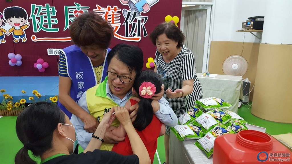 ▲台南市顏純左副市長,至活水幼兒園關心幼童流感疫苗接種的情形,親自安撫幼童施打接種流感疫苗。(圖/市府提供)