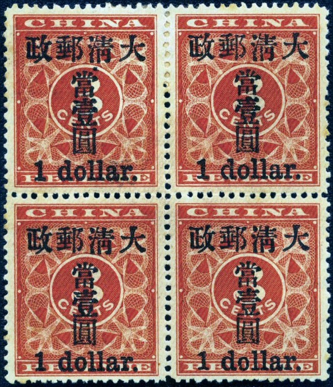 紅印花加蓋小壹圓四方連,原為海關費拉爾(Robert Alexis de Villard)所收藏,秘不示人,1904年費拉爾去世後,郵票由他的妻子繼續珍藏,直到1924年方為人知,1982年被集郵家以30萬美元購入,後經多次轉讓,預估目前價值近新台幣5億。郵票現在為中國上海集郵家丁勁松所珍藏,他也因此被封為「郵王」。