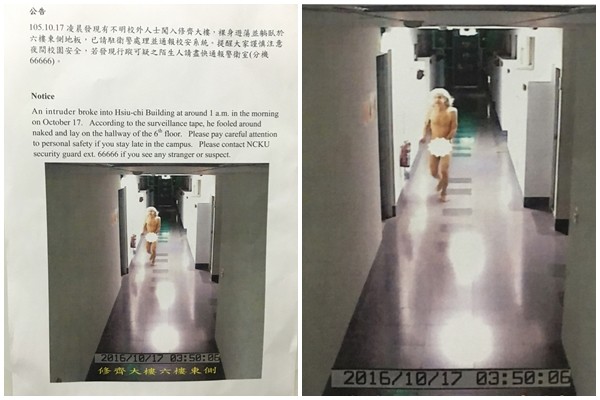 台南成功大學文學院「修齊大樓」出現變態裸男!校方貼出公告,指出17日凌晨有不明校外人士裸身闖入大樓,左手遮住下體遊蕩,甚至躺在6樓東側地板,畫面全被監視器給拍下,目前已由駐衛警處理,提醒學生注意夜間校園安全,若有發現可疑人士應盡快通報。