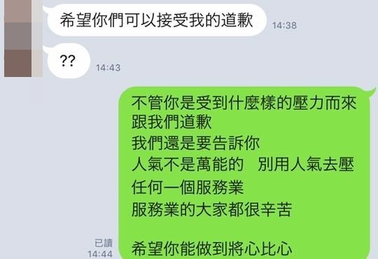 店家最後決定不理會這名男客,表明「不好意思,請您找別家髮廊,謝謝!」吳男聽聞後也不甘示弱回嗆「好的,我本來就沒打算去,你們態度很差,不應該得罪我,你們不知道我是誰,你們店的人氣比得過我嗎?當然不可能!」甚至還揚言要投訴業者。