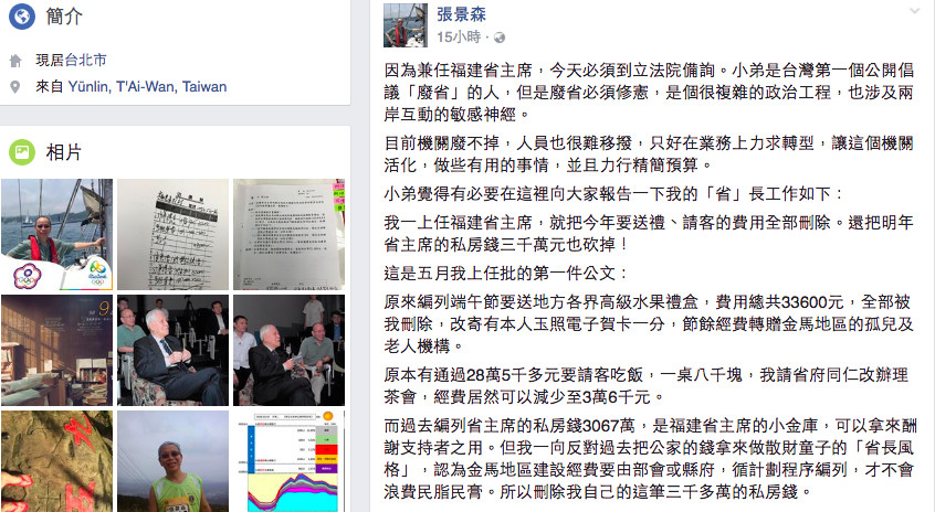 政務委員張景森一向喜歡在臉書上發言,他24日晚上在個人版面中寫到,他兼任福建省主席當起「省長」,把送禮、請客的費用全部刪除,改成有他本人玉照的賀卡;另外,將定期舉辦的餐會改成茶會,經費也從28萬改成3萬。他還透露,省主席過去編列拿來酬謝支持者的私房錢3067萬,他自己也把它砍掉。