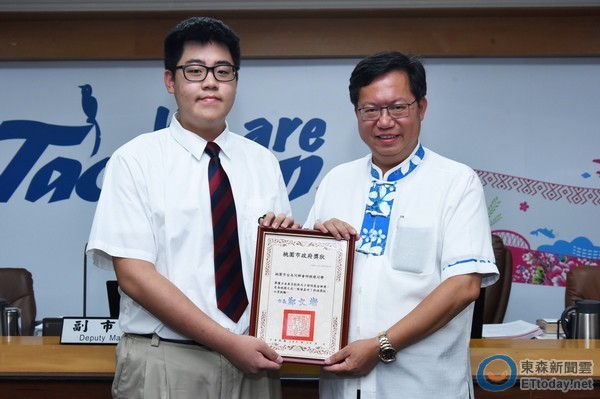 ▲鄭文燦頒獎表揚邱祥瑋,獲日本創新天才發明展金牌獎。(圖/桃園市政府提供)