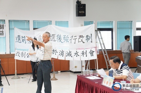 醒目的「選前強化自治、選後強行改制;維持現狀,反對改制…」等各種字眼抗議布條、掛板,10月26日置放在農委會於桃園農田水利會召開的「農田水利會組織改制意見徵詢會議」會場,爭相發言的隆隆砲聲,不斷表達水利農友對蔡政府,推行農田水利改制為公務機關的不支持與嚴重不滿。