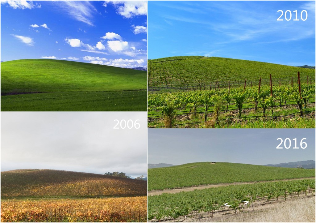 事實上,這張照片是由美國《國家地理頻道》攝影師奧利爾(Charles O’Rear)所拍攝,1996年6月25日開車前往加州女友家的途中,在索諾馬縣(Sonoma)納帕山谷一片起伏的葡萄園深深震撼,才拍下這個畫面,聲稱這張照片從未經過PS後製過。隨後微軟以高價收購這幅攝影。