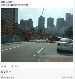 淡海輕軌又傳意外,28日早上10時許紅樹林捷運站往台北方向有施工吊臂掉落,原本的3線道阻塞僅剩1線可走,造成車流回堵,中正東路和登輝大道目前堵塞。竹圍分局獲報已前往協助疏散交通,初步調查並無人員傷亡,正在等待捷運工程局出動吊車將掉落的吊桿移除。