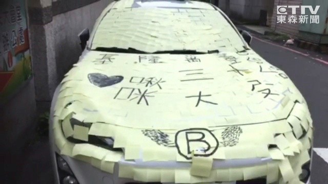 基隆市東信路35巷口一輛轎車被貼滿上千張便利貼,並用黑筆寫上「生日快樂」、「祝賀三十大壽」等字樣,路過民眾紛紛拍照留念,但因停在紅線上,車主也因此挨罰。
