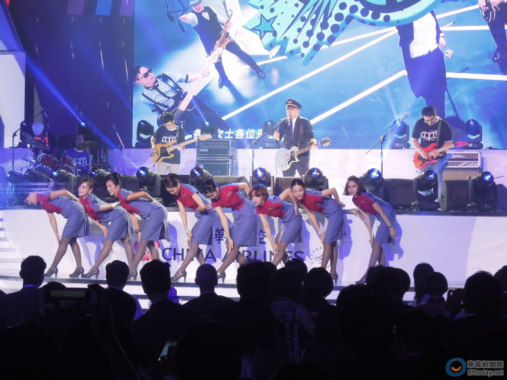 華航A350帝雉機今天首度亮相,並順利示範飛行台灣一圈,晚間的新機發表會,由脫拉庫樂團演唱主打歌「帶你飛翔」,台上更找來一群美麗空服員們熱情伴舞,揭開活動序曲,之後更在眾多嘉賓面前展示A350的全新性能。