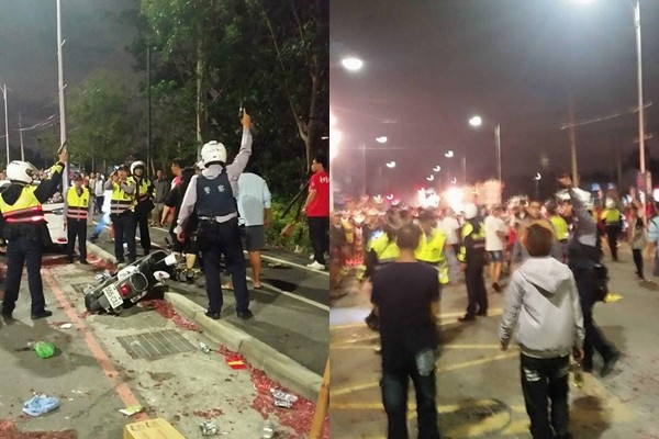 畫面中,現場群眾相當多,場面混亂,除了滿地的鞭炮殘骸外,機車也倒在一旁,數十名員警戴著安全帽趕到現場支援,對空舉槍一開就是4槍,嚇阻進一步衝突擴大。