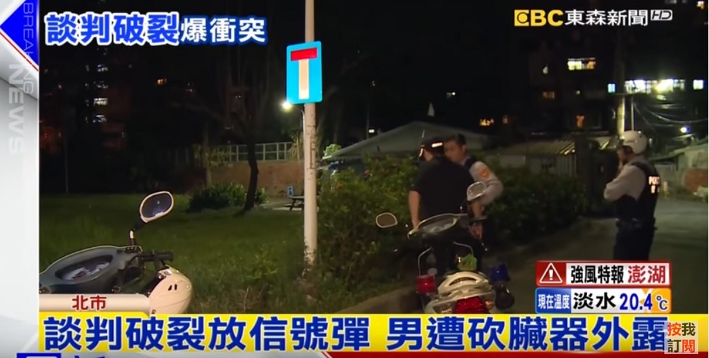 台北一名年約36歲的高姓男子,昨天深夜11點多,在林森北路399巷和3名男子談判,一言不合對方先點燃信號彈。接著拿刀朝他砍去,造成他臟器外露,情況相當危急,目擊民眾表示,「2個男的拔刀衝向他砍,他被砍肚破腸流的,坐在那邊,我們趕緊幫忙報警。」送醫之後已經沒生命危險,警方到場時,3人都已經逃走,正全力追緝中。