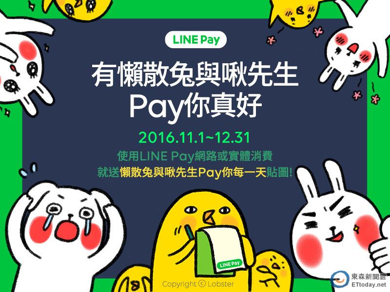 LINE Pay消費送人氣貼圖活動又來了!即日起至2016年12月31日止,使用LINE Pay在網路或實體消費就可以獲得「懶散兔與啾先生Pay你每一天」貼圖,充滿少女心的懶散兔配上呆萌啾先生,超療癒搭檔用了保證煩惱退散,千萬別錯過台灣限定版貼圖!