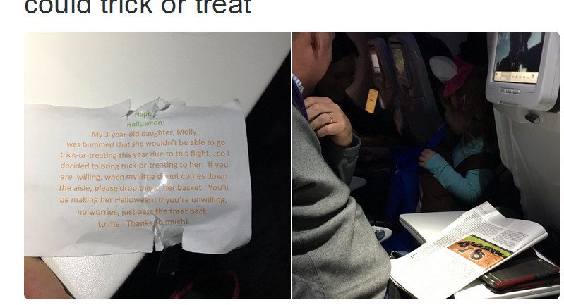 ▲3歲女兒想過萬聖節,爸爸串通機上乘客發糖果。(圖/翻攝自Stephanie Kahan推特)