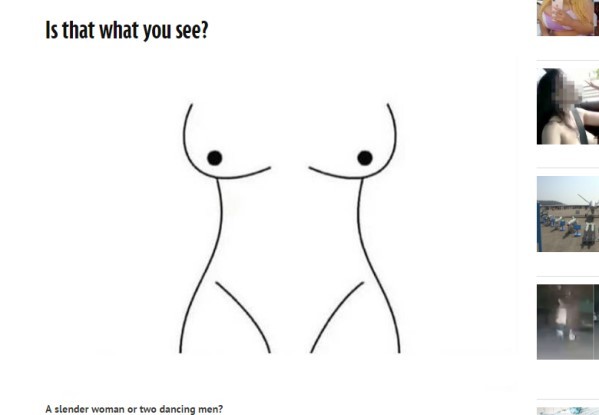 這張照片除了「裸女」之外,另外還有不同的解讀。有人看出這是2個火柴人熱情地跳舞。其中2個點分別是他們的頭,看似腰身的曲線,正好是他們對稱的四肢動作。