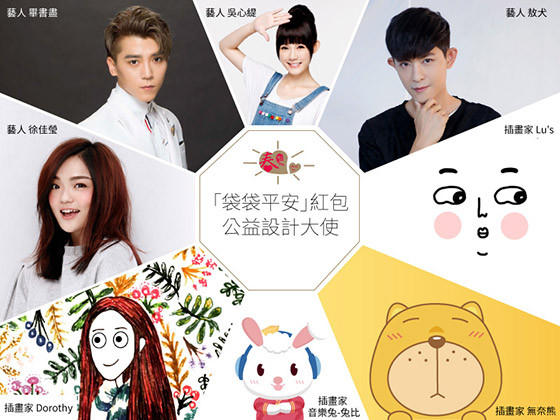 ▲第2屆「袋袋平安」義賣活動,由藝人畢書盡、徐佳瑩、敖犬、吳心緹以及網紅插畫家Lu's、Dorothy、無奈熊、兔比,擔任紅包設計大使。(圖/翻攝自17Life)