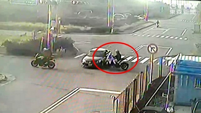 當時一輛黑色小客車一路直行,似乎沒看到紅燈,繼續往前開,接著有兩台重機從該車左方經過,第一台驚險閃過,但第二台杜卡迪(DUCATI)重機就直接撞上,騎士飛上小客車車頂,翻滾一圈才落地,送醫後發現手臂骨折需要開刀,不難想像當時撞擊力道之大。