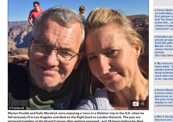 真的是人生無常啊!英國一名55歲的男子佛茲(Martyn Foulds),前陣子和女友蒙卓克(Sally Mondryk)到美國大峽谷遊玩,他當場向女友求婚,彼此互許終身。不料隔天佛茲卻突然暴斃身亡,這讓女友無法接受,事後醫院發現,原來他的腸子內有個15公分的巨大腫瘤,結果把腸子擠破還延伸到肝臟。