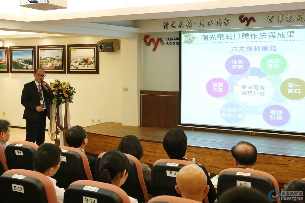 會中,大亞集團董事長沈尚弘談大亞根留台灣,及積極投資提昇產能和創造就業機會的歷程,台南市政府經發局長方進呈報告「台南陽光電城現況與未來」,讓蔡英文總統和貴賓對綠能產業在台南有更深入的瞭解。