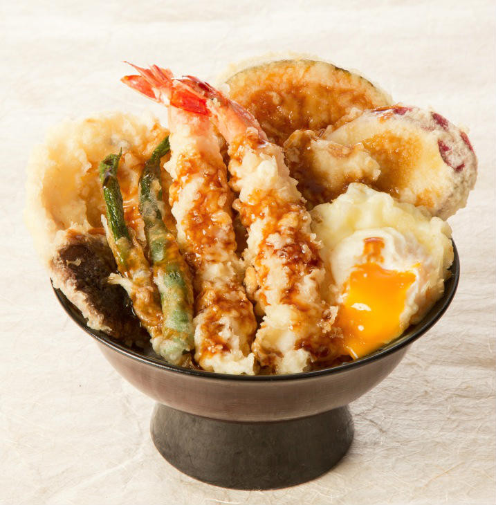 「天丼」指的是日式的天婦羅,其起源相傳在日本戰國時代,由葡萄牙傳教士所帶來的南蠻料理發展而來,傳統的日式天婦羅是用海產或蔬菜裹上澱粉漿(麵粉之類)油炸。在江戶時期,大街上的路邊攤隨處可見天羅婦的蹤影。當時店家在炸天羅婦時,都會先用竹串串起,炸好後再放在大盤上,客人在點餐時就把喜歡的食物,放進自己的丼碗中再淋上醬汁,於是就演變成現在的「天丼」。