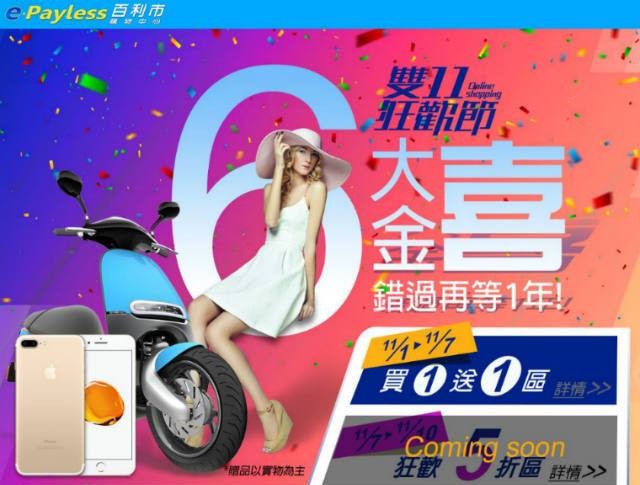 年度網購重頭戲「雙11」即將來臨,今年邁向第二年的百利市推出「雙11狂歡節 6大金喜」,第1大金喜-買一送一區;第2大金喜-狂歡5折區;第3大金喜-百萬送gogoro;第4大金喜-加入會員領雙倍購物金紅包;第5大金喜-銀行卡友最高回饋$1,500刷卡金;第6大金喜-期間內累積消費滿3次抽50吋電視。