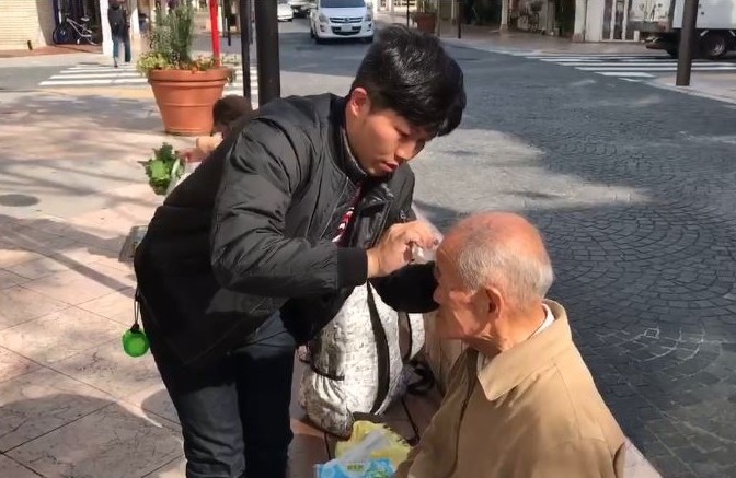 影片中,只見阿伯坐在路邊長椅上,周本部長則站在前面仔細地幫他清理傷口、上藥和包紮;整整5分鐘的過程中,雙方語言不通,僅能靠著「比手畫腳」和一點點最簡單的日語進行溝通,最後包紮完畢,阿伯不斷點頭致謝,場面相當溫馨。