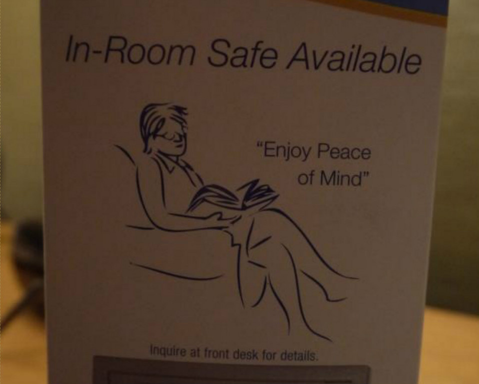 這張由網友Mattster092上傳的圖片,近日又重新受到網友熱烈討論,他分享旅館內的保險箱廣告,上面提醒旅客能使用保險箱,寄放重要物品,一旁還寫著「享受心靈平靜」,畫面中的男子,翹著腳悠哉看書,卻因插畫的錯視、錯覺(Optical Illusion)效果,讓大家看到的都不是這麼一回事!