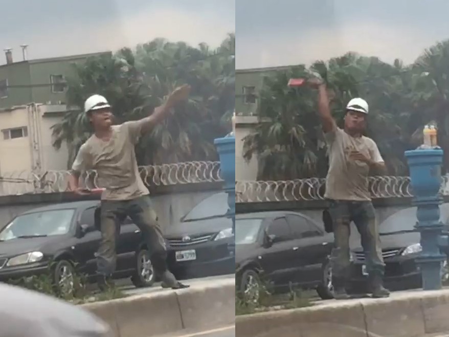 ▲工人在分隔島上指揮交通邊跳舞。(圖/翻攝「爆料公社」臉書社團,下同)