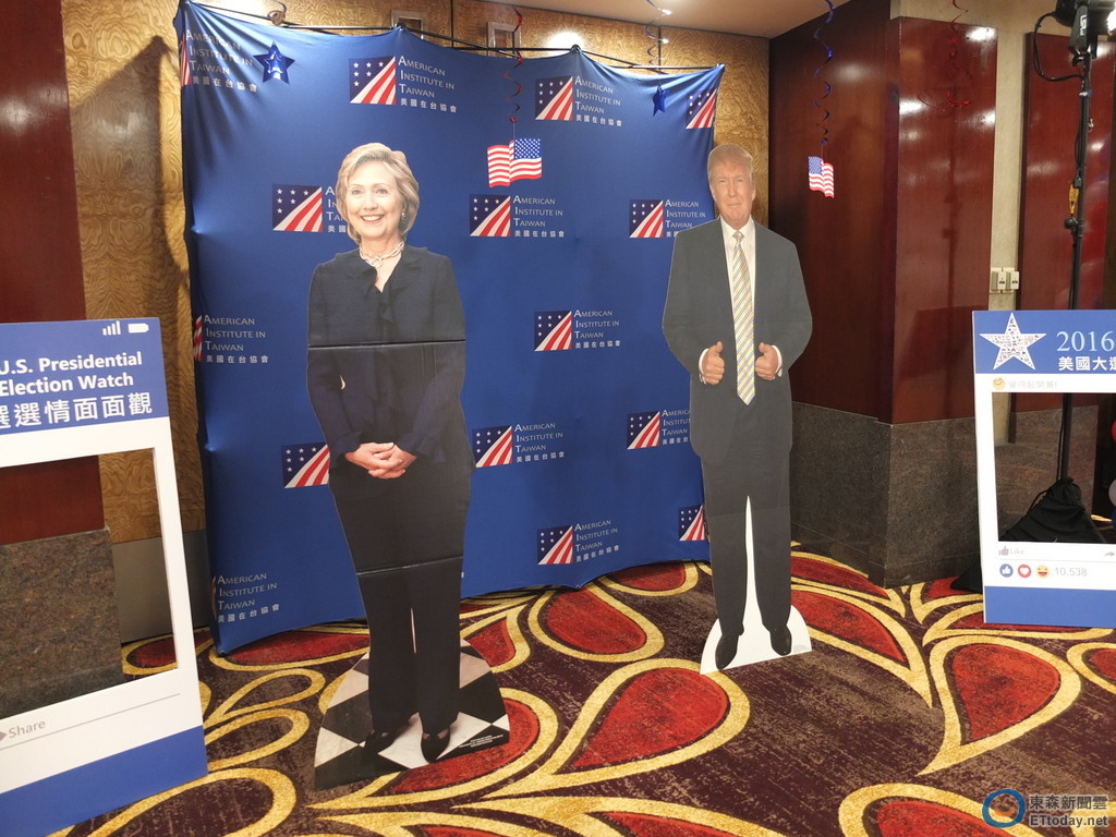 AIT與台灣民主基金會上午共同舉辦「美國大選選情面面觀」活動,現場準備了多台美國新聞的直播畫面,讓大家能一起觀看大選最新結果,並且也邀請專家學者舉辦座談會。同時,現場也舉辦模擬選舉,還有兩名候選人的照片可合影,吸引不少民眾紛紛上前拍照。