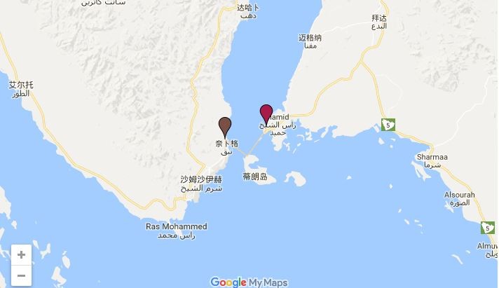 ▲蒂朗島及塞納菲爾島位於亞喀巴灣南端,扼守進入紅海的通道,地理位置和戰略地位均很重要。(圖/翻攝google map)