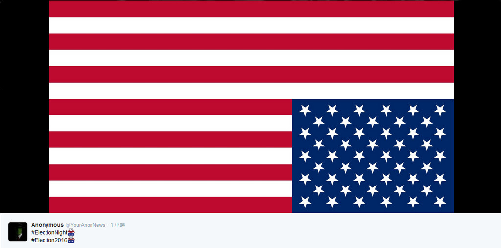 共和黨候選人川普確定當選第58屆美國總統,引發連鎖效應。166萬人追隨的匿名者(Anonymous)推特(twitter)9日發推文,放上一張倒掛的美國國旗。清楚回應川普當上美國總統,一切盡在不言中。
