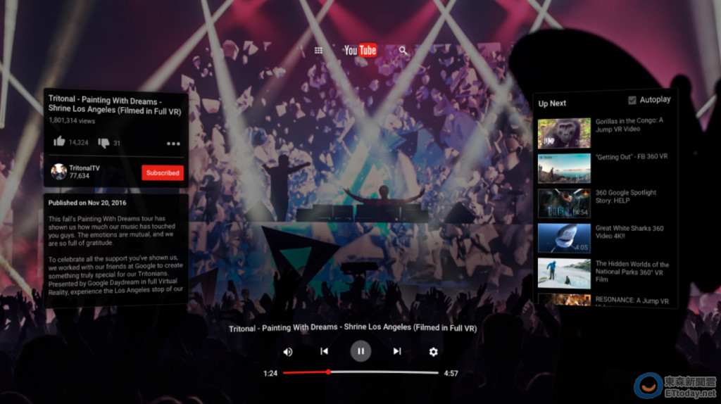 早在去年底,YouTube 便已經開放用戶可以上傳 360 影片與相關內容, 而在稍早 YouTube 終於釋出 YouTube VR 應用程式,首波率先登陸通過 DayDream VR 認證的手機,讓用戶們可以透過鍵盤或者是聲控的方式,搜尋並操作 YouTube VR 影片,進一步沉浸其中。