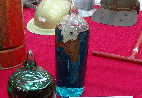 所有展覽物品中,包含了日據時代以及40、50年代消防單位的檔案與救難器材,其中兩個玻璃瓶特別受到大家的關注,它們一個裝著藍色液體,另一個則是盛裝透明液體,經記者詢問之下才知道,它就是早年的滅火器,命名為「滅火彈」。